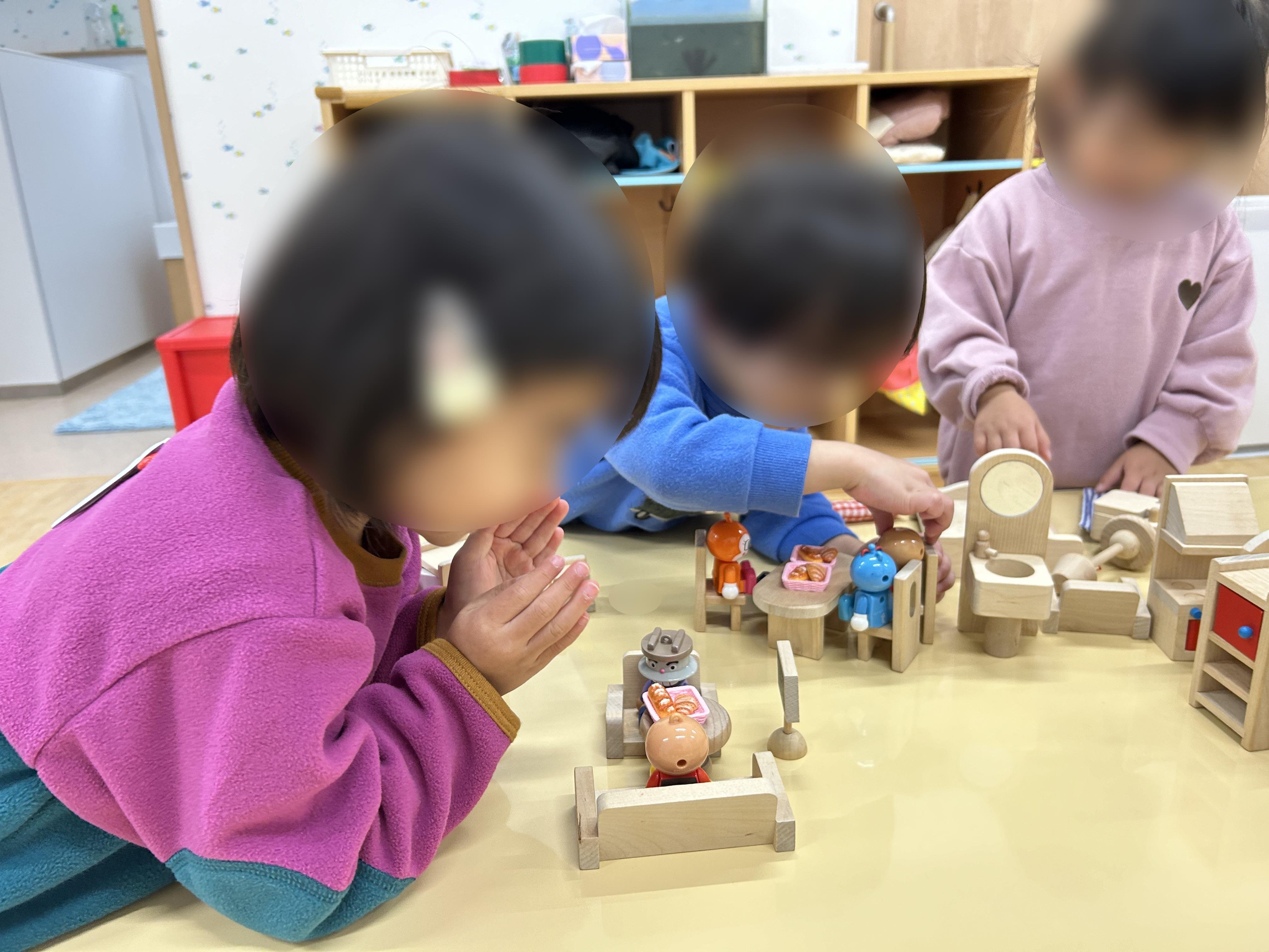 未就園のお友達がお人形遊びをしました。 物の貸し借りも少しずつ練習しています。