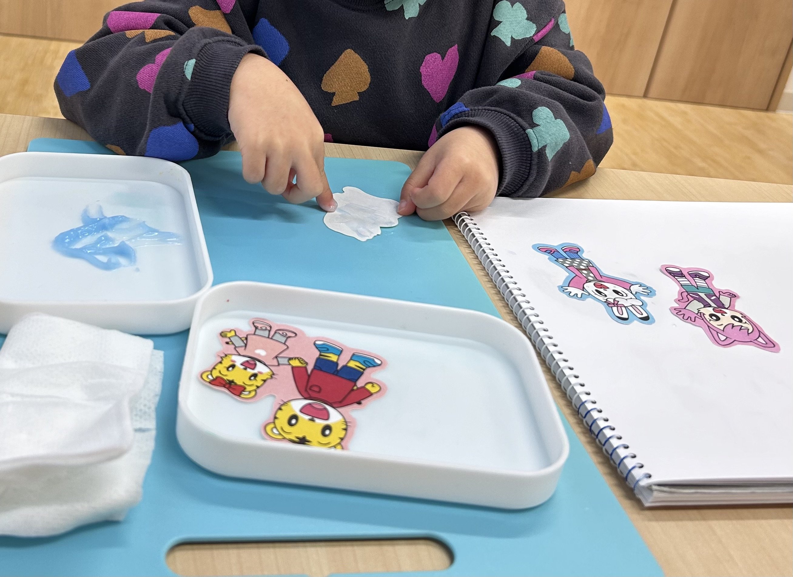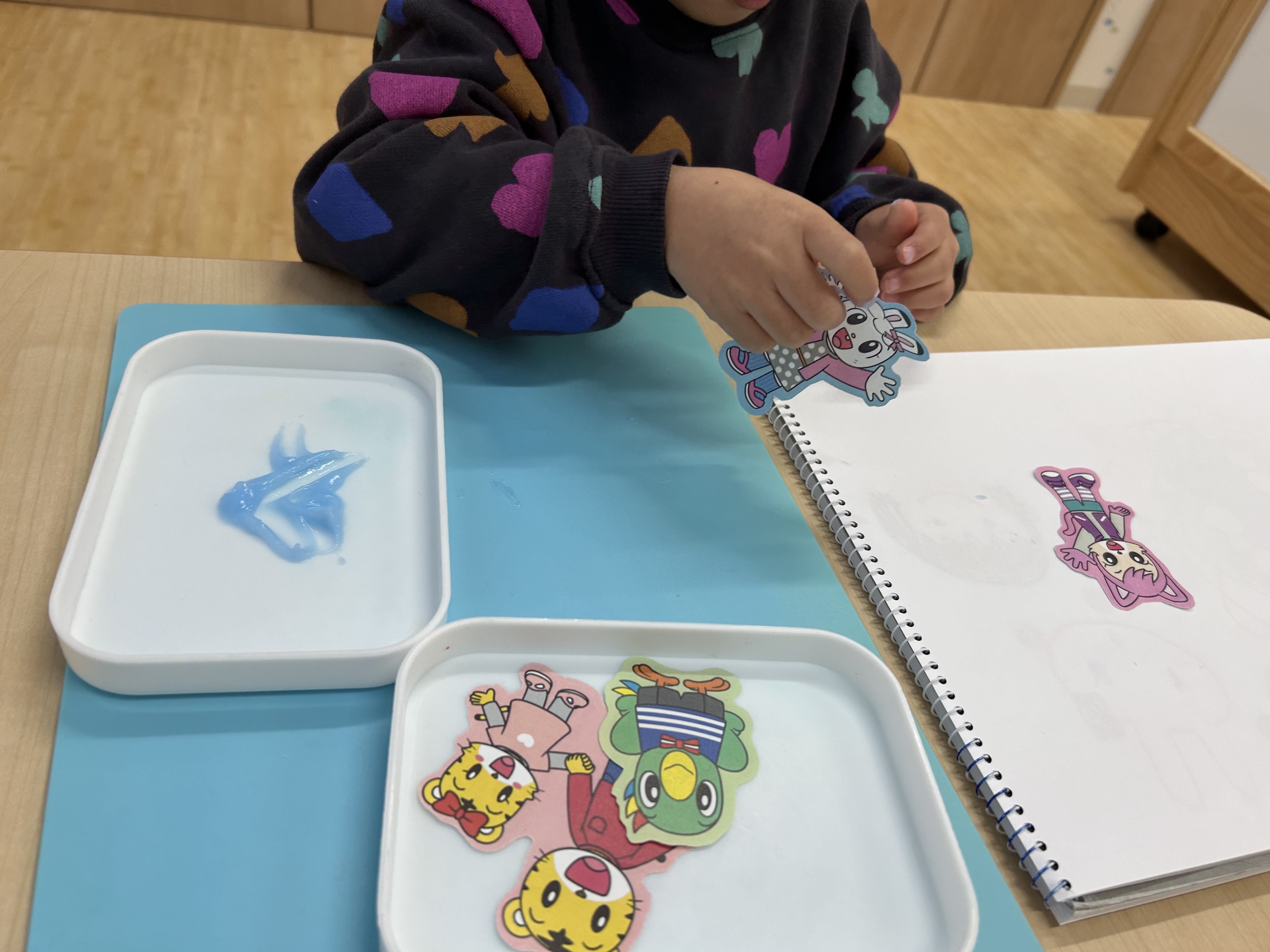 未就園のお友達がのり遊びに挑戦です。 のりの感触を味わいながら、少しずつ貼る練習をしていきます。