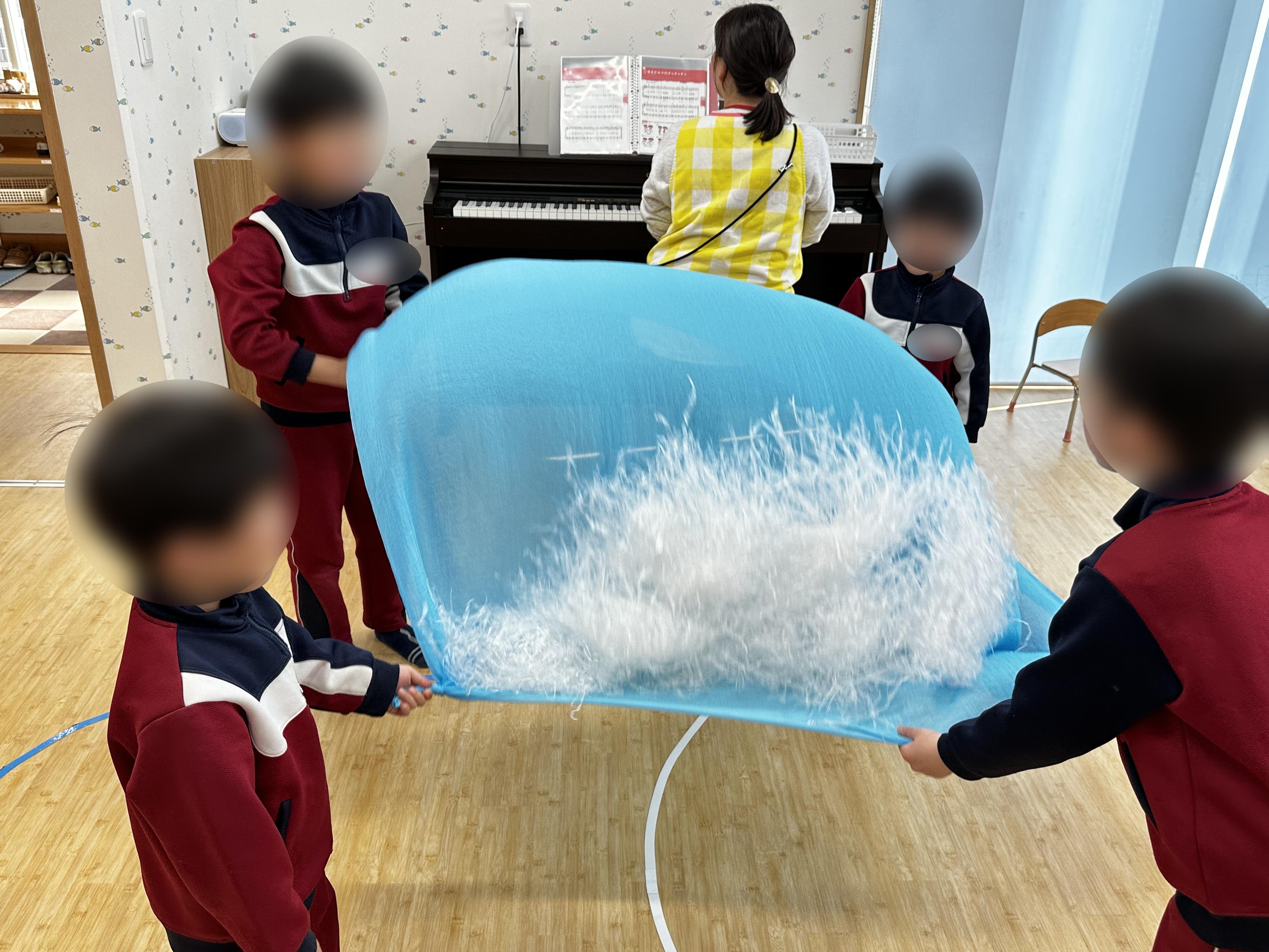 音楽に合わせて、雪に見立てたポンポンで遊びました。
